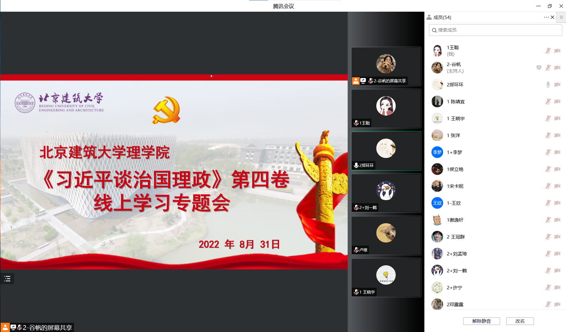 紧接着,学生党员纷纷发表自己的心得。研究生第一党支部卢维表示从习近平总书记在庆祝中国共产党成立100周年大会的重要讲话精神中感受到了中华民族的骄傲与自豪;王晓宇向大家分享了北京冬奥会冬残奥会的成功举办对于国家发展意义重大,并表示自己争取早日投身到国家的技术研发和推广应用领域。研究生第二党支部刘一鹤分析了中国正处于百年未有之大变局的情势,呼吁大家要坚定中国特色社会主义道路,坚持中国共产党的领导,要始终相信国家相信党;王中伟分享了两个专题的学习心得,要加强党史的学习,要坚定“四个自信”,发扬青年党员冲锋在前的精神。本科生党支部马懿玢从理论中分析学与用的统一辩证关系;李卓成呼吁大家要把小我融入大我,增强服务意识与大局意识。