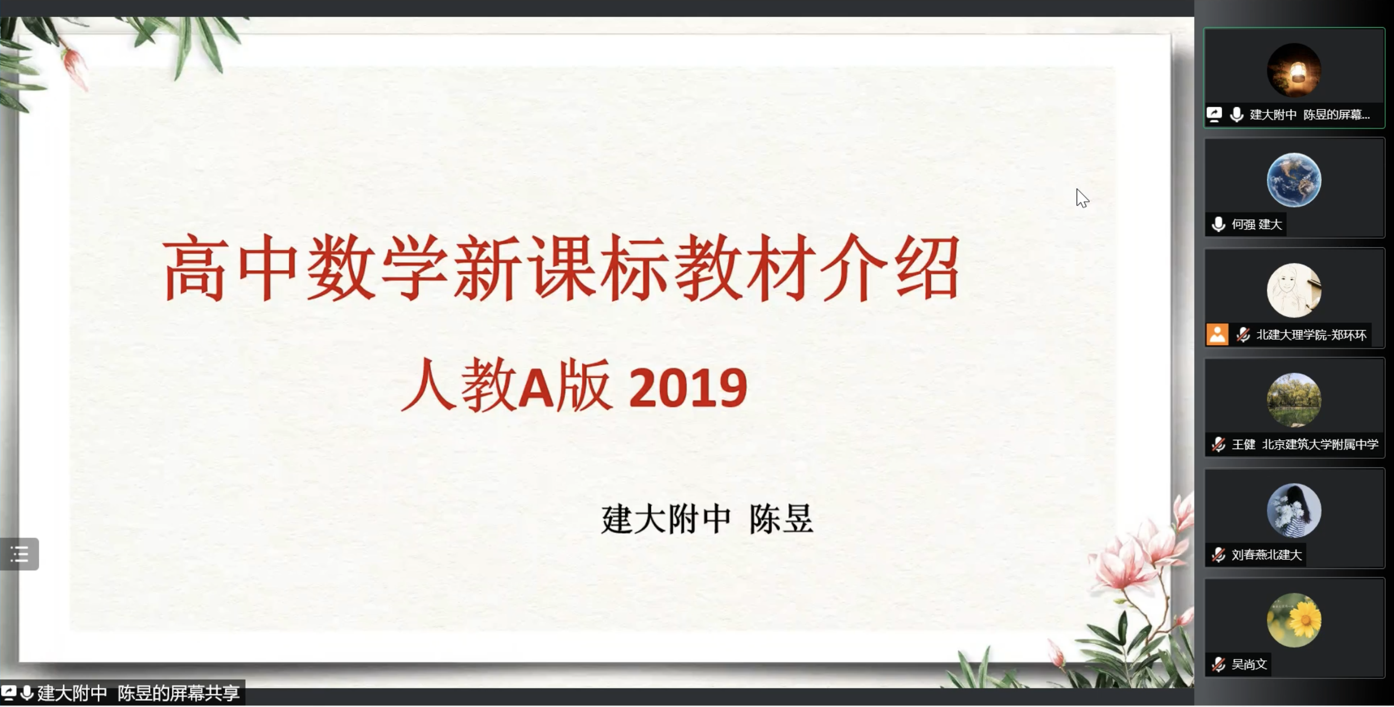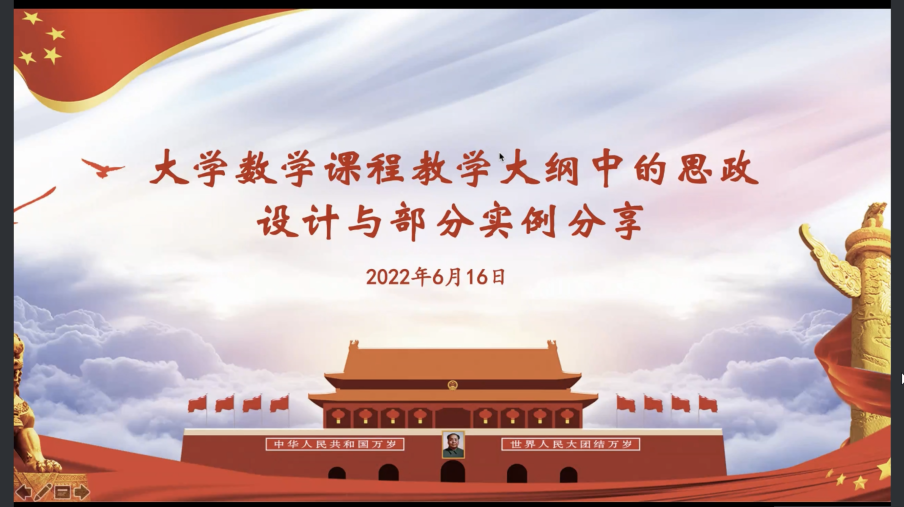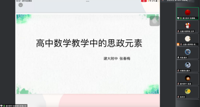 接着参会教师就“数学课程中的思政元素”进一步深入交流。四川麻将游戏 数学与数据科学系教工党支部书记王乔作题为《大学数学课程教学大纲中的思政设计与部分实例分享》的报告,介绍了高等数学和概率论与数理统计教学大纲中的思政设计,并穿插展示了部分实例。建大附中朱娟和张春梅分别做题为《在高中数学教学中如何实施思政教育》和《高中数学教学中的思政元素》的报告,从思政点的起因、必要性、实施和效果以及数学的美育元素、试题中的思政元素、学习过程中的思政元素等方面介绍了高中数学教学中的思政。