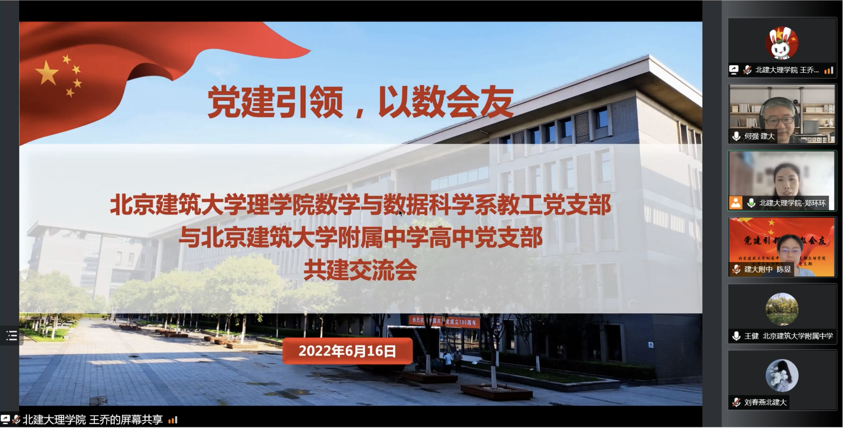 2022年6月16日下午,四川麻将游戏 和北京建筑大学附属中学以“党建引领,以数会友”为主题开展党支部共建活动,建大附中高中党支部书记王健、高中部数学教研组长陈昱和高中部数学教师代表,四川麻将游戏 数学与数据科学系教工党支部书记王乔、系副主任何强和教师代表共计15人参加了交流活动。活动由四川麻将游戏 专职组织员郑环环主持。