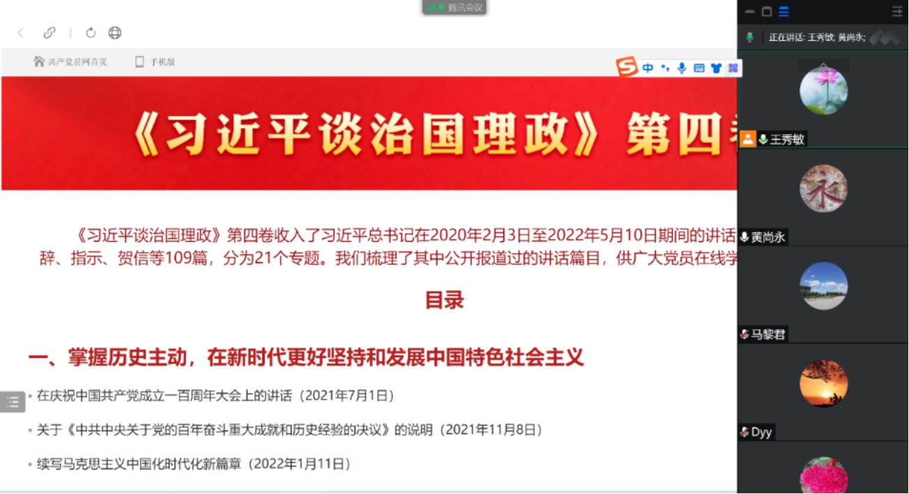 8月26日下午,大学物理与实验教学中心教工第二党支部在线组织全体党员开展“学习《习近平谈治国理政》第四卷”主题党日活动。大会由党支部书记王秀敏主持。