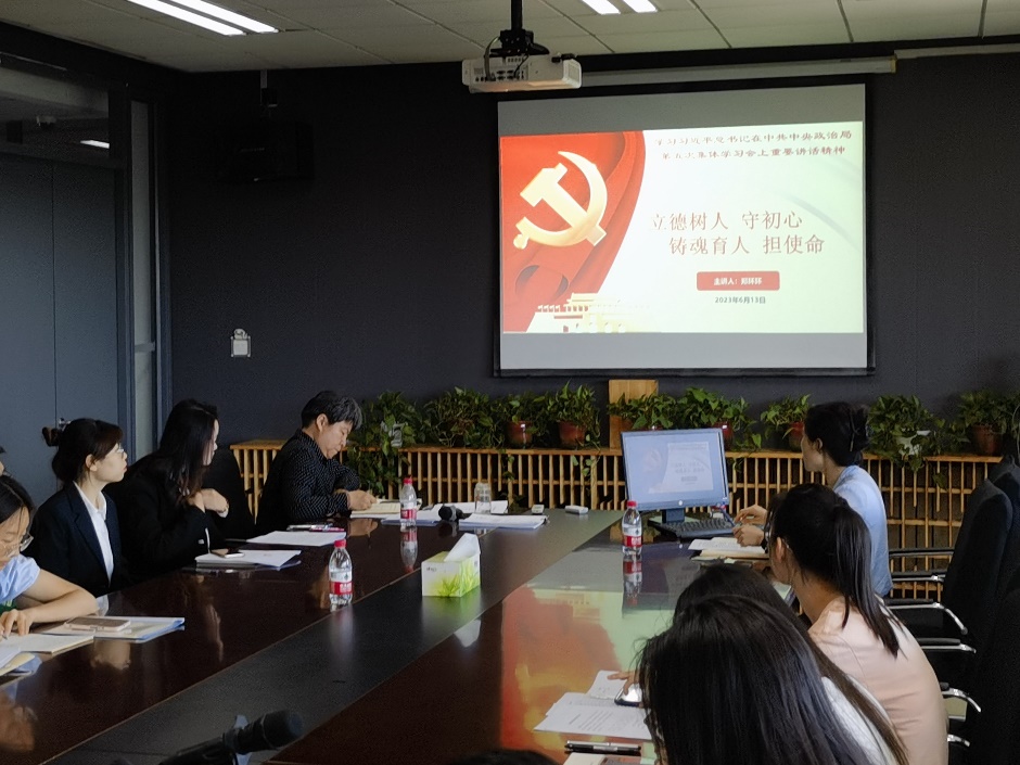 随后,党支部书记郑环环以“立德树人·守初心 铸魂育人·担使命”为主题,带领大家共同学习了习近平总书记在中共中央政治局第五次集体学习会上重要讲话精神。她从建设教育强国的重要意义、全面落实立德树人根本任务、作为新时代青年我们应该怎么做三个方面与支部同志进行了沟通交流。郑环环提到,建设教育强国,是全面建成社会主义现代化强国的战略先导,是实现高水平科技自立自强的重要支撑,是促进全体人民共同富裕的有效途径,是以中国式现代化全面推进中华民族伟大复兴的基础工程。培养什么人、怎样培养人、为谁培养人是教育的根本问题,也是建设教育强国的核心课题。新时代新征程,坚持和加强党对高校的全面领导,要以“立德”为根本、以“树人”为目标,坚持为党育人、为国育才的初心,确保高校始终成为落实立德树人根本任务、培养堪当民族复兴重任的时代新人的坚强阵地。