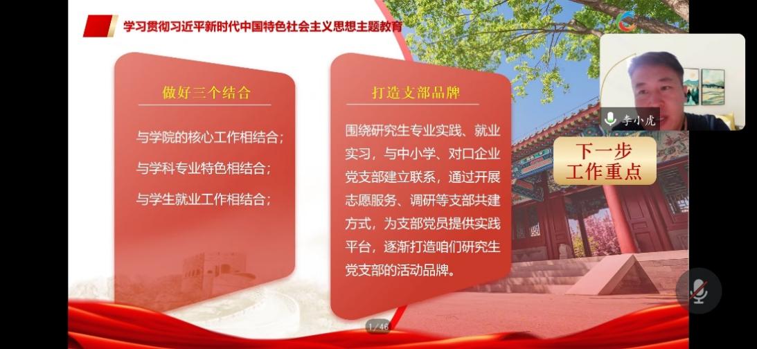 随后,李小虎以“学深悟透 真抓实干 力促发展——学习贯彻习近平新时代中国特色社会主义思想主题教育”为题,从坚持“三学联动”、开展“三级调研”、实施“五大工程”、抓好问题整改等方面进行展开,结合四川麻将游戏 发展现状,提出下一步工作重点。要将支部发展与四川麻将游戏 的核心工作、学科专业特色与学生就业工作做好结合,同时围绕研究生专业实践等情况,打造支部品牌。李小虎引用知名校友金奕的职业发展历程与心得体会,呼吁同学们面对困难要敢于迎难而上,做有理想、敢担当、能吃苦、肯奋斗的新时代好青年。