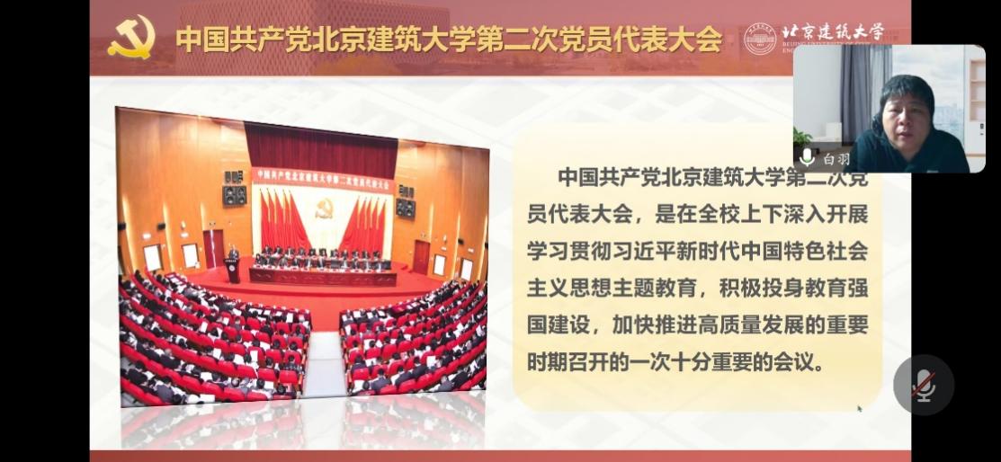 同时,白羽结合北京建筑大学第二次党员代表大会的会议内容,向支部同志宣讲了学校五年来取得的辉煌成就,以及新时代新征程下学校发展的新目标新使命。并号召同学们,紧跟学校发展目标,紧密团结在以习近平同志为核心的党中央,为全面建设社会主义现代化国家,全面推进中华民族伟大复兴作出新的更大的贡献。