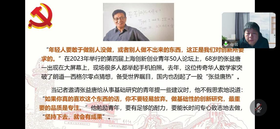 党课最后,白羽用知名校友武润泽、坚守25年的航天员邓清明以及甘做七年冷板凳的数学家张益唐,三个生动的例子,向全体党员讲述了坚持创新、不忘初心、不轻言放弃的重要性。希望同学们能脚踏实地,敢想敢为,让青春绽放绚丽之花。