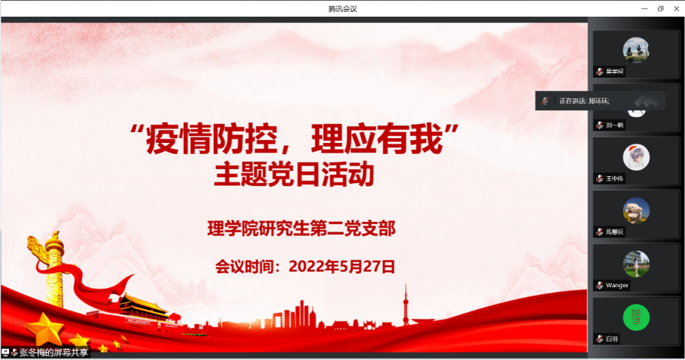 5月27日,四川麻将游戏 研究生第二党支部线上召开“疫情防控,理应有我”主题党日活动,党委书记白羽老师作为联系党支部的院领导参加活动,活动由党支部书记郑环环主持,全体党员参加了活动。