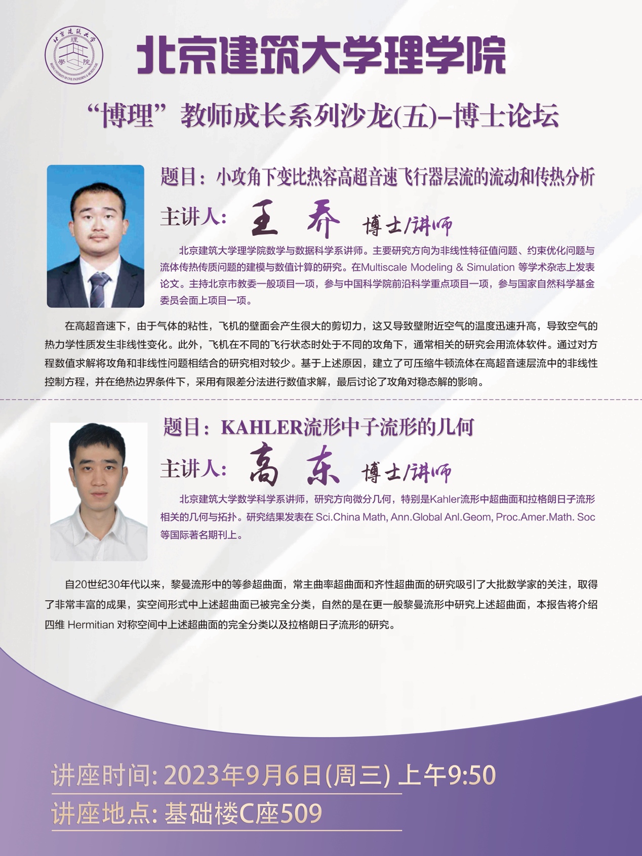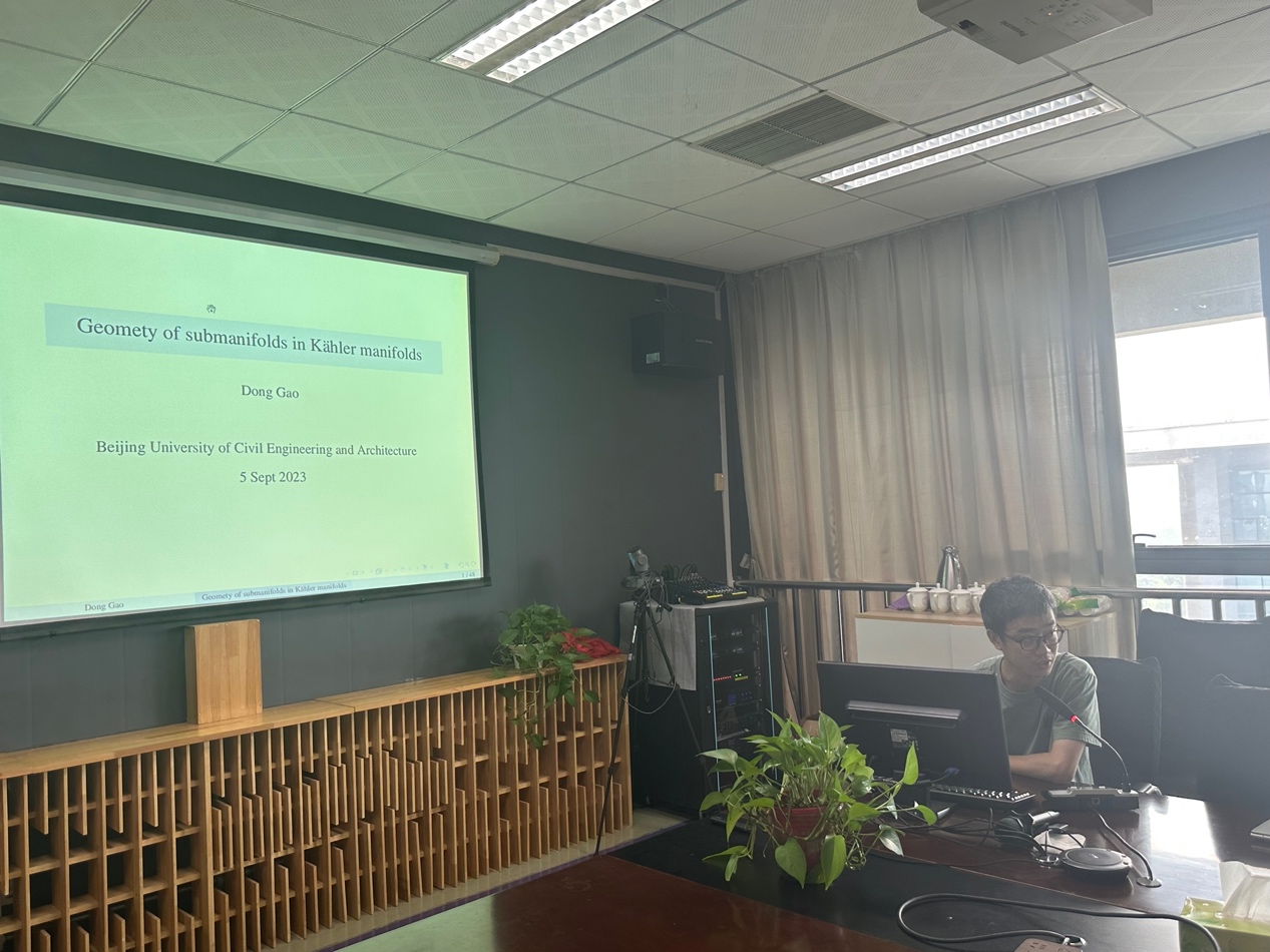 本期沙龙活动由副院长刘茂省主持,活动邀请的两位主讲人分别是偏微分方程数值计算领域的王乔老师和微分几何领域的高东老师。首先,王乔博士以“小攻角下变比热容高超音速飞行器层流的流动和传热分析”为主题,介绍了可压缩牛顿流体在高超音速层流中的非线性控制方程模型的建立,以及在绝热边界条件下采用有限差分法进行数值求解的计算结果,并讨论了攻角对稳态解的影响。随后,高东博士以“KAHLER流形中子流形的几何”为主题,介绍了等参超曲面齐性超曲面的研究背景,并和大家分享了四维Hermitian对称空间中等参和齐性还有常主曲率超曲面的研究进展。
