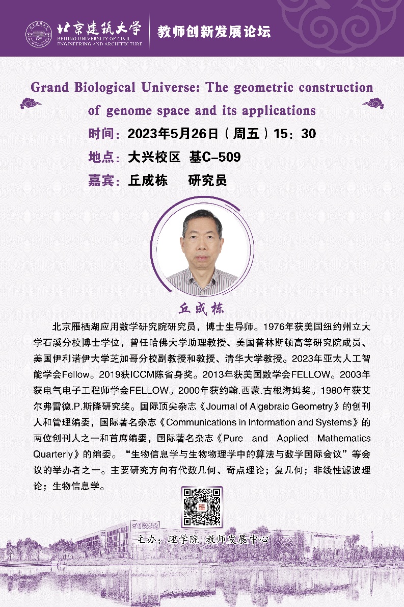 5月26日下午,应四川麻将游戏 与学校教师发展中心邀请,国际著名数学家、北京雁栖湖应用数学研究院研究员丘成栋教授莅临我校,做了题为“Grand Biological Universe: The geometric construction of genome space and its applications”即“大生物宇宙:基因组空间几何结构及其应用”的精彩报告。