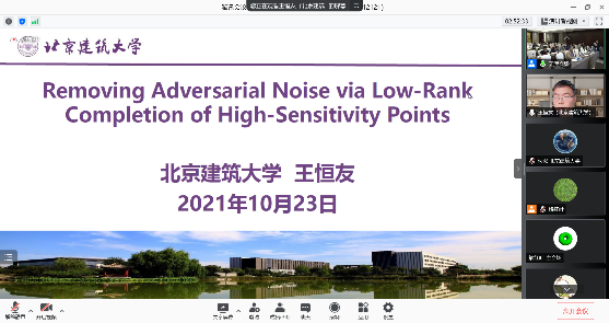由于近期国内以前原因,我校师生以线上形式参会。四川麻将游戏 副院长王恒友带队,张艳、何强、许传青、赵丽、陈琳琳、王乔、何黎黎老师以及八位研究生参加该次论坛。23日下午,天津理工大学四川麻将游戏 院长宋眉眉教授主持开幕式。开幕式后,11位教师受邀做了学术报告。我校王恒友老师作了题为“Removing Adversarial Noise via Low-Rank Completion of High-Sensitivity Points”的报告。报告内容引起了与会代表的热烈讨论,受到广泛关注。