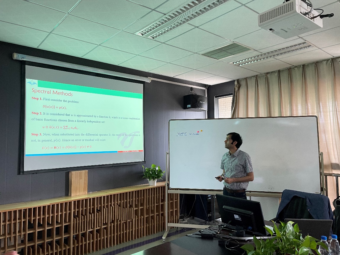 此次报告,Hamid博士主要从以下五个方面:1.纳米流体的起源;2.方腔流的模型建立;3.有限元方法;4.谱方法;5.结论与展望介绍了自己近年来在流体力学、偏微分方程的数值计算方面的研究内容。报告中详细介绍用有限元法求解流动传热模型。报告结束后,Hamid博士针对老师和同学们提出的问题一一进行了详细解答,并和大家展开了热烈地讨论。