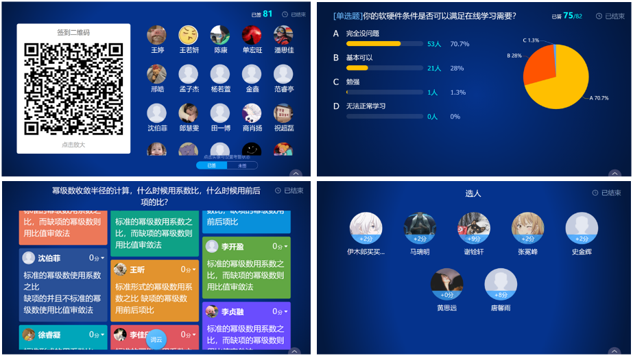 签到二维码自动更新。高等数学课时多,班容量大,且非行政班教学,造成课程考勤效率低下。本学期将超星学习通签到二维码同步至投影屏幕,学生扫码签到,且二维码每10秒自动更新,保证了签到信息真实性。并不定时采用位置签到或拍照签到等形式。课堂上,通过学习通发布问卷,选人以及主题讨论等活动,在活跃课堂气氛与增强师生互动的同时,也有效防止早退发生。对于出勤率较低学生及时预警干预。通过以上多项举措,本学期学生出勤人均超过95%。