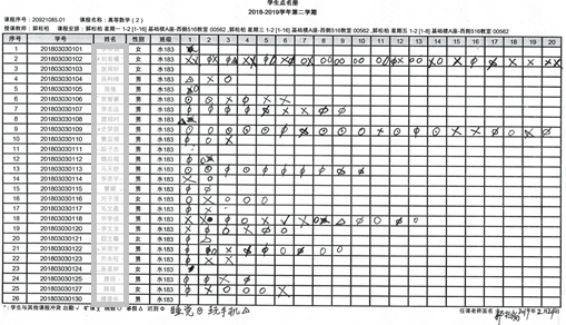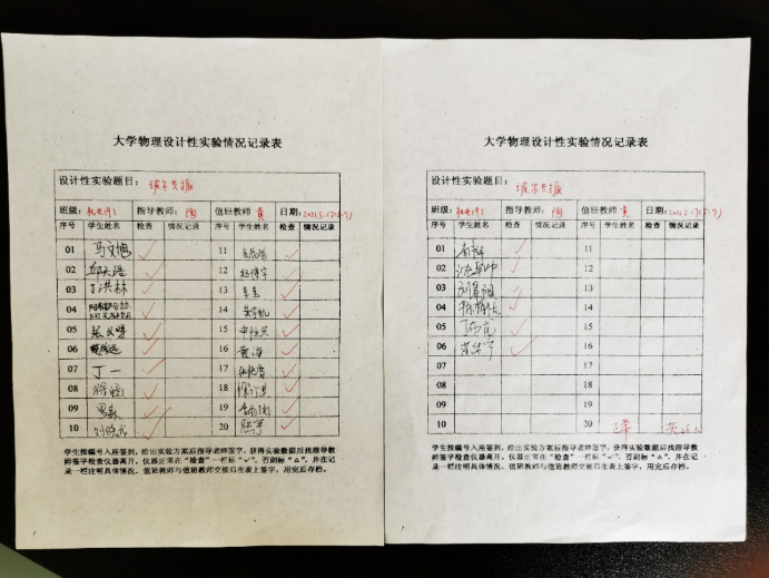 课前课后两次签。学生课前十分钟来到实验室,在签到纸上签上自己的名字,坐在几号桌就把名字签在签到纸相应的号码上。上课期间教师检查学生的预习报告、观察学生的实验操作过程以及检查学生的实验数据。实验结束后教师检查学生是否将用过的实验仪器整理好。教师在学生名字旁边打勾以表示所有环节已经完成。并将学生人数备注在签到纸上。如果仪器有问题或学生出现某些错误会在情况记录里备注。