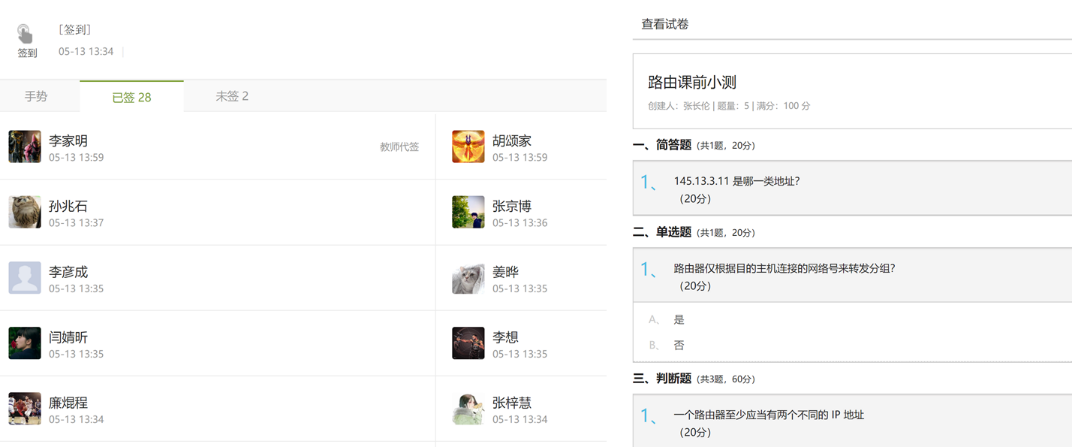 理论课实验课都手签。理论课采用一个一个点名的方法,即进行了考勤,又熟悉了同学。第二节课时再随机进行一次超星学习通APP签到,防止有人早退。实验课让同学们进实验室时采用手写签到的方法。