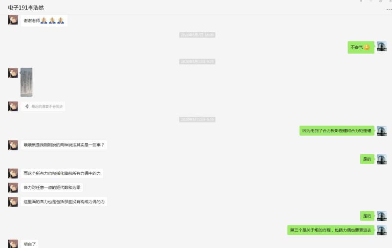网络为我们提供了及时快捷的沟通手段。除了线下课堂,现在学习过程可能发生在任何时间和地点。当同学们在预习、复习、做作业、做设计过程中遇到需要和老师沟通的任何情况,可随时通过微信、学习通等讨论,如果单独通过文字或语音问题不容易被解释清楚,在同学方便的情况下可开启腾讯会议实时讲解。这样的线上答疑方式有三个优点:1. 问题被及时高效解答;2.便于同学保存答疑过程,有利于日后反刍消化;3.同学们感觉自己的学习状态被老师时时关注和肯定,这对他们是非常正面的鼓励。