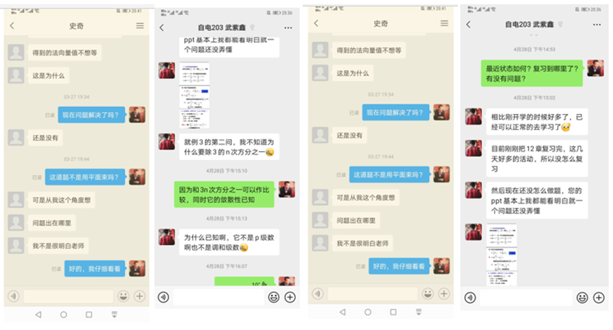 “师者,所以传道授业解惑也”,答疑是课程教学过程中的必不可少的环节。随着现代教育技术的快速发展,答疑形式已从单一的固定教室固定时间答疑,发展为时时刻刻的微信答疑、手机APP答疑、视频会议答疑等多种形式,但是不变的是教师们关爱学生的心。
