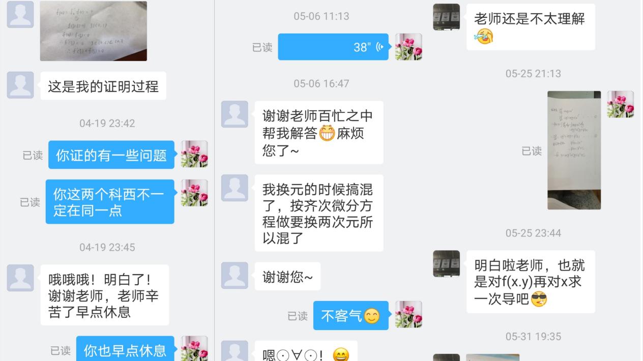 始终以学生为中心,认真教学,采用多种形式为学生答疑解惑。负责我校考研数学答疑辅导工作,目前和其他老师一起利用学习通平台开设了三门考研数学相关答疑课程。学生进入该课程后可随时利用语音、留言、图片等形式向老师提问,老师收到问题后也可以通过语音、图片等方式及时回答。学生如果问题较多,也可以与老师沟通约定时间线下办公室答疑。由于答疑形式灵活方便,深受学生喜欢,越来越多有考研梦想的学子从中受益。