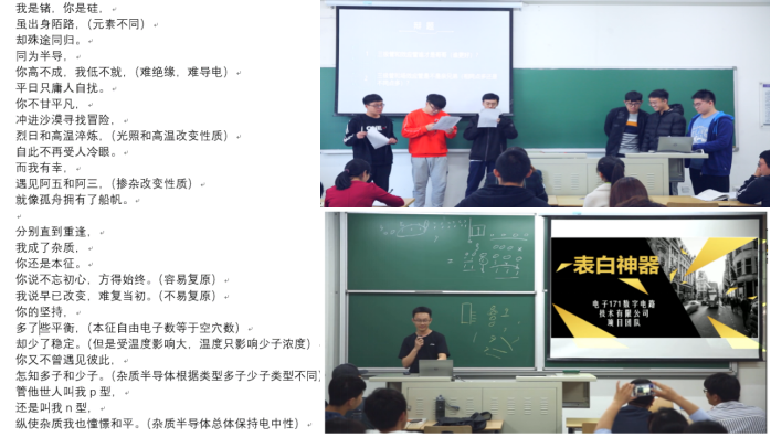 利用平台我开展了一系列新奇有趣、形式多样的线上线下活动,激发了学生的学习兴趣和课堂参与度,提高了学生分析问题、解决问题的能力,促进学生深度学习,培养高阶思维。如通过诗歌故事歌词大赛,鼓励学生将枯燥的专业知识用优美的诗句、有趣的故事描述出来,增强课堂趣味性(图1左为学生作品);借鉴“奇葩说”节目组织“仙葩说”辩论大会,将三极管和场效应管相同点多还是异同点多,哪种元器件更好的问题辩析清楚(图1右上为辩论双方进行battle);通过组织“电路设计与展示大赛”,将比赛现场搬至课堂,让学生既完成电路设计,也将所设计电路的应用场景通过情景剧、产品发布会等形式展示出来,让学生在角色扮演中开动脑筋,加深对知识的理解(图1右下为学生以产品发布会的形式展示其电路作品“表白神器”);用“我来比划你来猜”这个小游戏来调动课堂气氛,通过让学生阐述课程中的1-2个专有词,并由其他同学猜的形式,增强学生对基本概念理解与记忆;通过“大家来找茬”,让学生互相查找自己录制的习题讲解视频的问题,实现更优解,达到朋辈学习互促的效果;通过“课间茶歇”,让学生在课间分享学习经验,比如有学生分享如何在他们熟悉的游戏平台上搭建数字电路的经验,提升其他学生学习数字电子技术的兴趣。