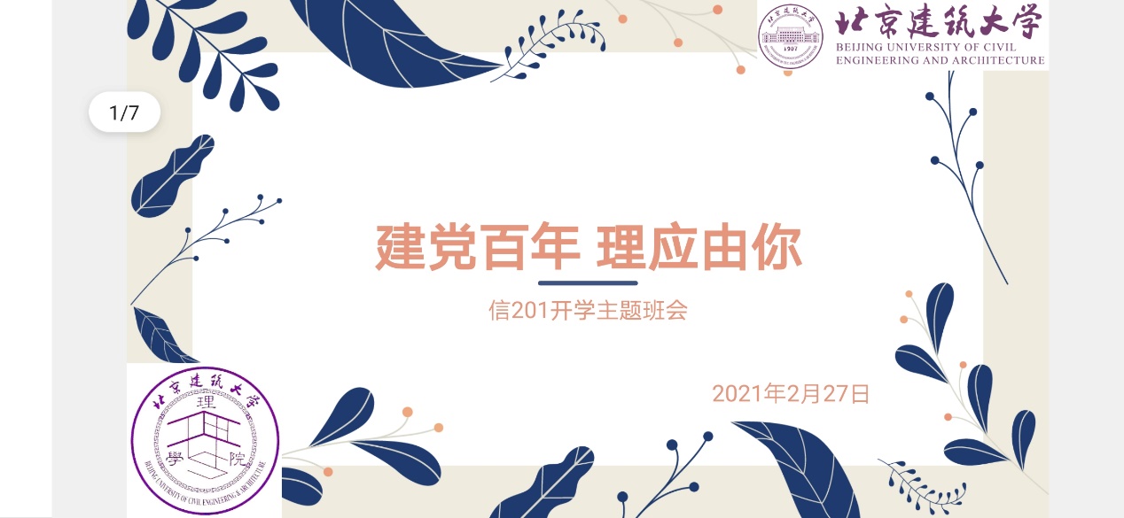信171班围绕“迎接中国共产党成立一百周年及新征程、新起点、新作为”主题开展了2021年春季新学期班会。在班会中,同学们抒发了对党和祖国的美好祝愿,以及自己的新年展望。同学们认识到:一代又一代中国共产党人的努力才让我们生活在如今这样一个和平幸福的环境里。作为一名沐浴着党的光辉成长的青年,我们当承担起建设祖国的重任,在新时代将党的思想精神传承创新和发扬光大!