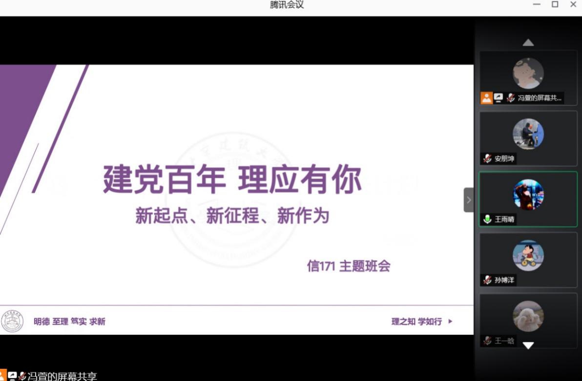 在电子171班班会中,同学们交流到:2021年是建党一百周年,是实现第一个百年计划的关键节点。在习近平新时代中国特色社会主义思想指导下,中国共产党领导全国各族人民,推动中国特色社会主义进入新时代。习近平总书记寄予广大青年,要在实现中国梦的生动实践中放飞青春梦想,在为人民利益的不懈奋斗中书写人生华章!通过本次班会的主题教育,增强了高校青年大学生对马克思主义和中国特色社会主义的理论、情感和思想认同。