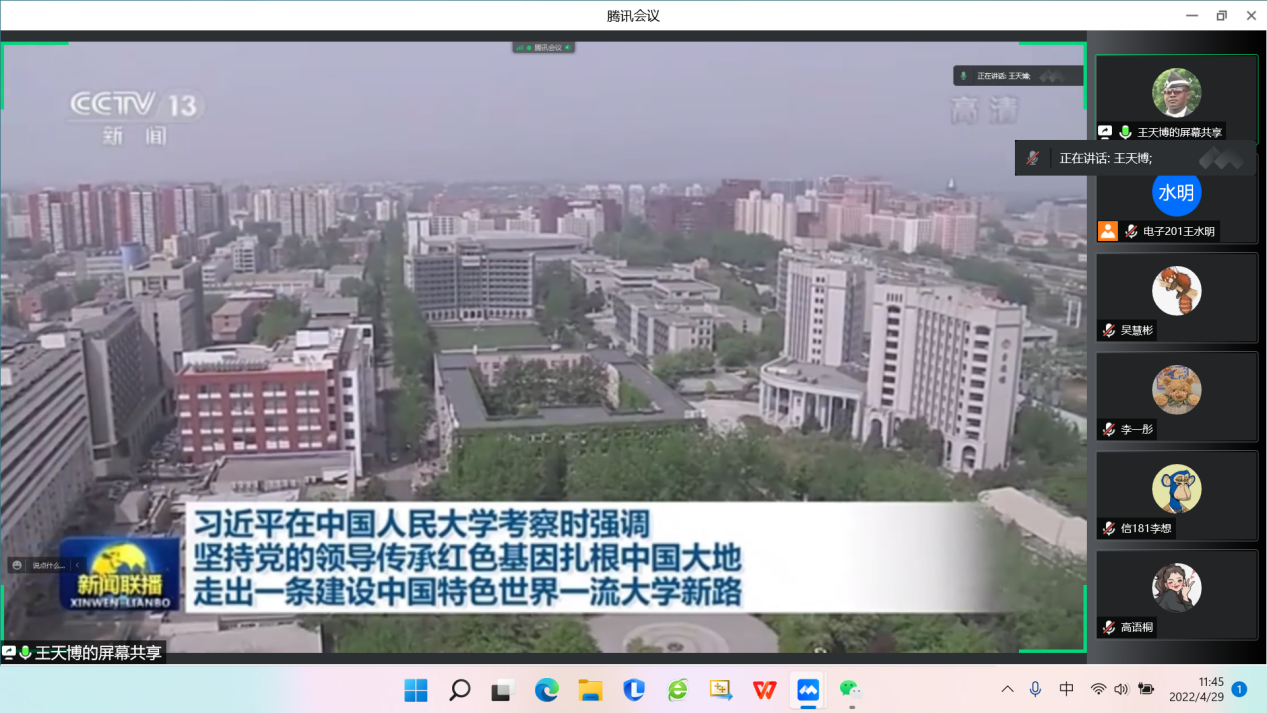 围绕习近平总书记在中国人民大学的重要讲话,四川麻将游戏 本科生党支部于4月29日中午线上召开主题党日活动,掀起学习习近平总书记讲话精神的热潮,四川麻将游戏 本科生党支部全体党员参加。首先,大家集体观看了央视关于习近平总书记到中国人民大学考察时的新闻报道。随后,围绕习近平总书记讲话内容,党支部党员代表进行了专题发言并分享了自己的学习体会、感受。活动中通过交流和学习,党员们深感习近平总书记对青年一代的寄语字字千钧、令人深受鼓舞和振奋,坚定了听党话、跟党走,立大志、明大德,成大才、担大任的信念,将刻苦努力、锤炼本领、砥砺前行,做社会主义核心价值观的坚定信仰者、积极传播者、模范践行者,在理论与实践的结合中争做堪当民族复兴重任的时代新人。