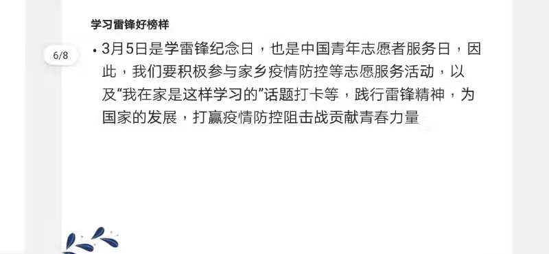 信201班开展了“我在家是这样学习的”话题打卡活动,结合个人实际,畅谈以学习雷锋为契机规划好新学期规划的感受和体会。同时号召同学们积极参与家乡疫情防控等志愿服务活动,以实际行动践行雷锋精神,牢记初心、勇担使命,为国家的发展和社会的进步贡献青春力量。