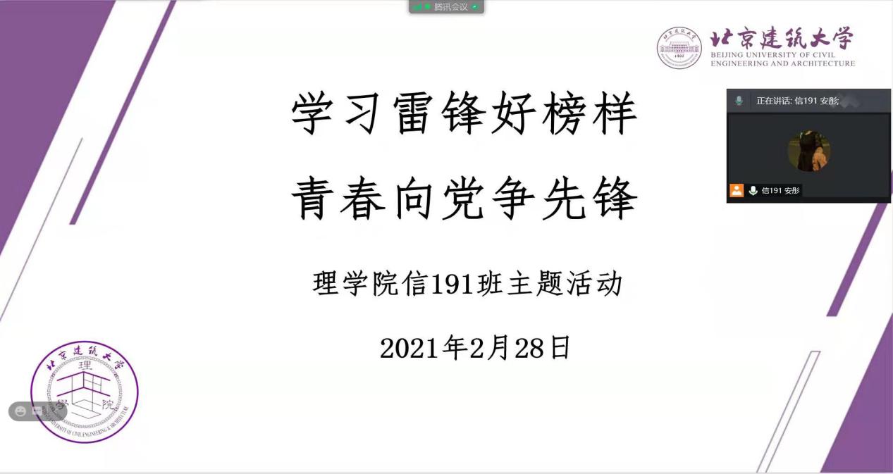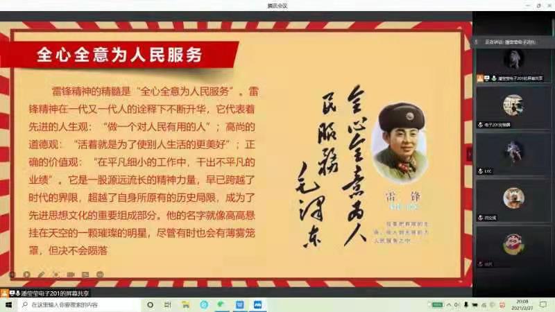 信191班同学们云上相聚,在迎接2021年新学期到来的同时,形成良好的氛围号召大家发扬雷锋爱岗敬业、志愿服务的精神,将刻苦钻研的“钉子”精神用在自己的实际生活中,同时锲而不舍地刻苦钻研专业知识,用更好的专业能力、专业精神践行雷锋精神,也为党的百年华诞献上青春力量。