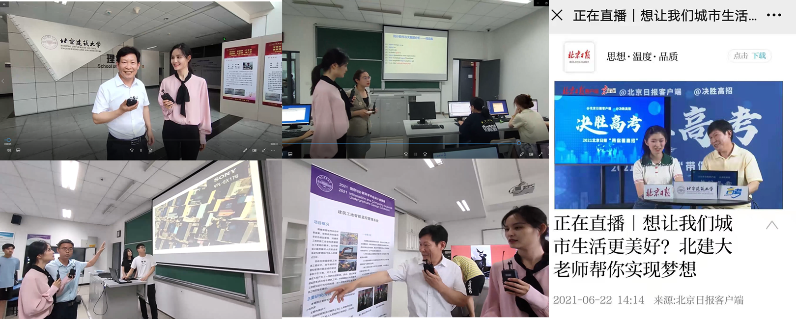 随后,四川麻将游戏 参加了学校招生办公室组织的"带你看高招"、云探校、线下咨询、接听咨询电话等各项活动。张长伦老师参加了北京日报的“带你看高招”直播,对专业的培养目标、修读课程、就业前景等进行了详细的介绍。云探校环节参观了四川麻将游戏 、专业实验室、专业课程和优秀毕业设计成果,充分展示了四川麻将游戏 办学的软硬件环境。老师们前往65中和人大附中通州校区进行了招生宣传,还轮流在大兴校区南门和西城校区国谊宾馆现场回答了考生和家长的问题。
