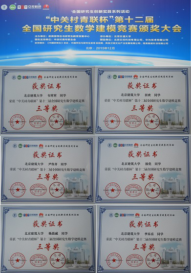 全国研究生创新实践系列活动——“中关村青联杯”第十二届全国研究生数学建模竞赛颁奖大会于12月12日上午在北京交通大学举行,我校有2队6人获三等奖,7队21人获成功参赛奖,这是我校学生首次参加全国研究生数学建模竞赛。
