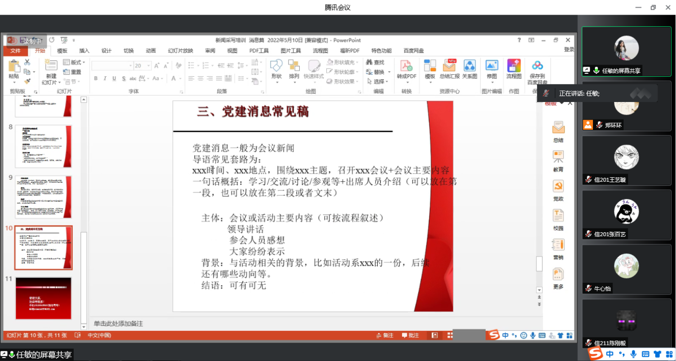 培训会上,任老师从新闻写作基础知识入手,结合自身多年的工作实践,以“公式”的方式讲述新闻写作套路;以“解剖麻雀”的形式分析优秀案例,并传授了党建消息写作的一些试用技巧。她的讲解生动清晰、明了易懂,使大家对新闻写作有了更深入、更全面的认识和掌握。