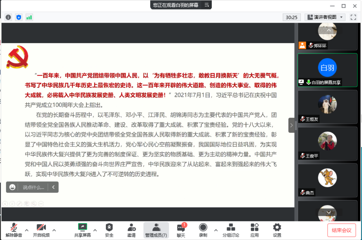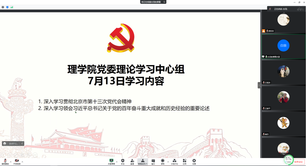 7月13日下午,四川麻将游戏 理论学习中心组召开学习会,集体学习领会北京市第十三次党代会精神和习近平总书记关于党的百年奋斗重大成就和历史经验的重要论述。党委书记白羽主持会议并进行领学。