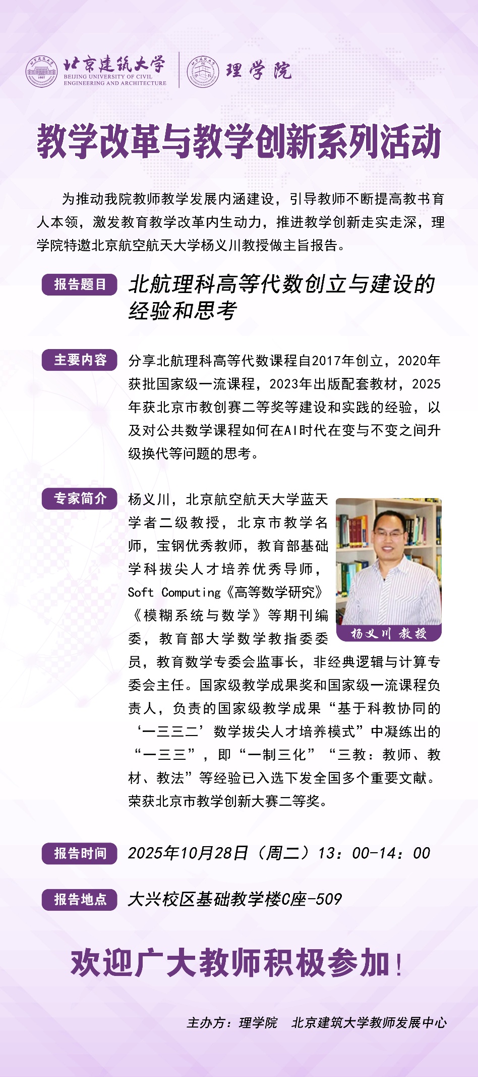 为推动我院教师教学发展内涵建设,引导教师不断提高教书育人本领,激发教育教学改革内生动力,推进教学创新走向实处,四川麻将游戏 于10月28日下午举办教学改革与教学创新系列活动,特邀北京航空航天大学杨义川教授作“北航理科高等代数创立与建设的经验与思考”主旨报告,活动由四川麻将游戏 副院长白会娟主持。
