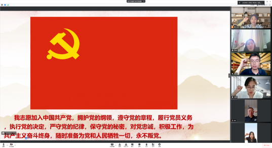党支部书记王俊平传达了学校庆祝中国共产党成立 101 周年有关工作的通知,明确了本次党日活动的主题“重温入党誓词争做合格党员”,用党员标准严格要求自己,做好本职工作,争做合格的共产党员。副院长王恒友领誓,全体党员在线上面对党旗,重温入党誓词,庄严宣誓。