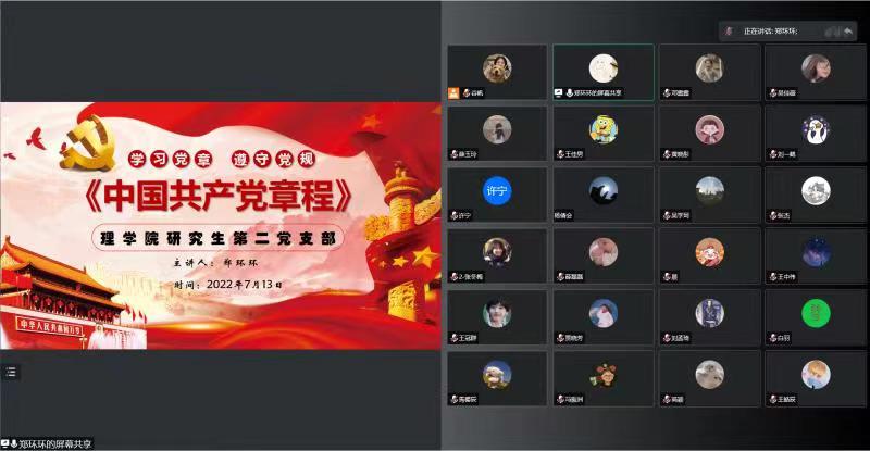 7月13日,四川麻将游戏 研究生第二党支部开展党课学习,由党支部书记郑环环讲《中国共产党章程》和《中国共产党党员教育管理工作条例》,全体党员参加了学习,党委书记白羽作为联系支部的院领导参加了会议并讲话。