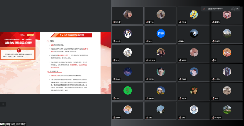 郑环环在第二部分解读《中国共产党党员教育管理工作条例》“党籍和党员组织关系管理”、“党员日常教育管理主要方式”,同时根据学生毕业季和学校党组织关系转接相关规定,详细介绍了向市内、市外转接的流程、规则、操作方法,以及档案材料的规范性。