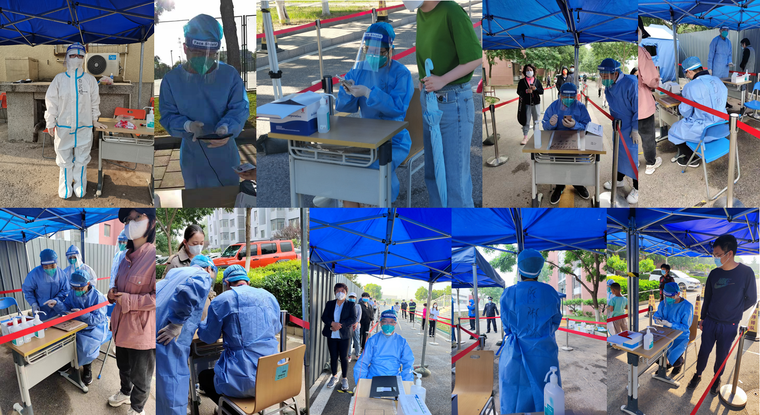 有的教师化身“大白”和“小蓝”,在校园核酸检测中参与人员登记和秩序维护工作,不一会儿汗水就浸湿了全身。