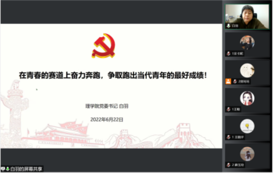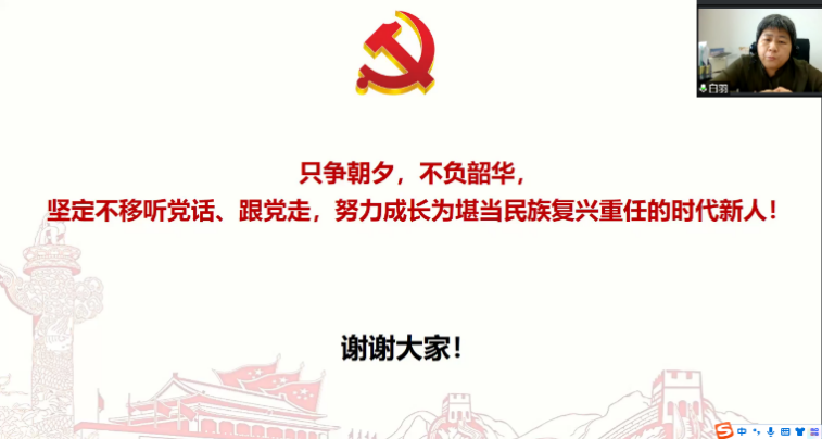 白羽以《在青春的赛道上奋力奔跑,争取跑出当代青年的最好成绩》为题,用青春的“优秀事迹”向大家讲述了一个个感人的故事,优秀青年北大援鄂医疗队刘金鹏、第一书记黄文秀、英雄航天员王亚平、短道速滑冠军武大靖、年轻“麦克”王连杰、快递小哥汪勇等人的优秀事迹,向世界证明了新时代中国青年追梦的力量充满了无畏与坚持。身边榜样理研19级杨倩会、理研20级唐巧丽、理研21级杨韶宇等同学积极承担新时代赋予青年的使命,共同守护家乡人民的健康与安全。邢思等9名本科生和刘一鹤、申小桐两名研究生同学参加冬(残)奥会志愿服务,将小我融入大我,新时代青年当以祖国的繁荣昌盛引以为傲,并用奋力拼搏的精神为祖国添光溢彩。