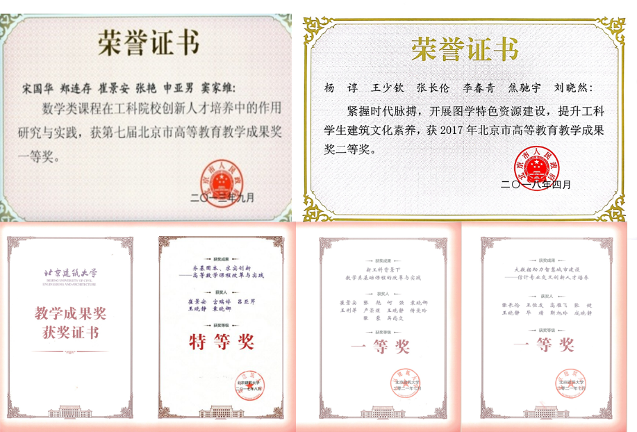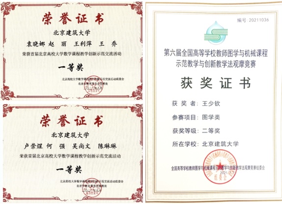 教师教学能力大幅提升。先后荣获北京高校青年教师教学基本功比赛一等奖1项,包揽最佳教案、最受学生欢迎、最佳教学反思、最佳现场展示和优秀指导教师等全部5项单项奖,二等奖1项和最佳教学反思奖;获全国高等学校教师图学与机械课程示范教学与创新教学法观摩竞赛图学类二等奖1项;首届北京高校大学数学课程教学创新示范交流活动中获一等奖2人,二等奖1人;第二届北京高校教师教学创新大赛获优秀奖1人;校青年教师教学基本功比赛获一等奖5人;校首届教学创新大赛获一等奖、二等奖和三等奖各1人;校首届教书育人“最美课堂”评比获一等奖、二等奖各1人;校教学优秀奖评选中获一等奖、二等奖和三等奖各2人;6位新入职教师教学能力考核合格,优秀3人。