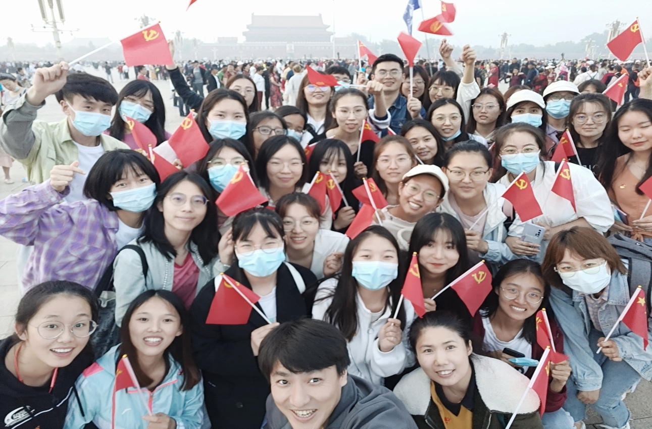 在升旗仪式结束后,41名师生党员一起走向人民英雄纪念碑,自发挥动手中的国旗、唱起《我和我的祖国》:“我和我的祖国一刻也不能分割,无论我走到哪里都流出一首赞歌”,共同追忆中国共产党建党百年的风雨激昂岁月,感慨伟大祖国崛起的繁荣昌盛,抒发建功立业新时代的使命责任。