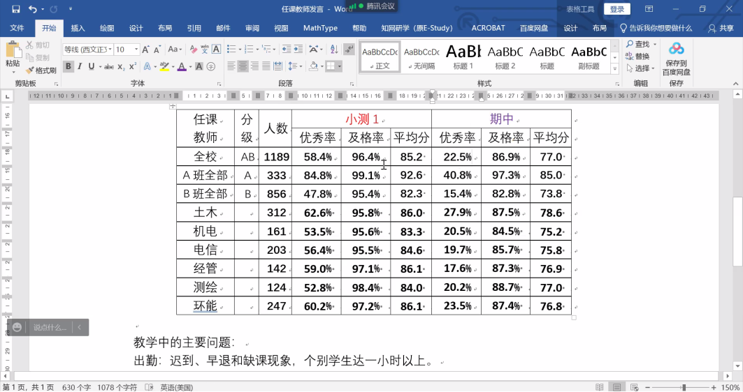 随后,何强老师对第一次随堂测验和期中考试成绩进行了分析,强调了本学期第二次随堂测验的时间和题型,并汇总了本学期线上授课中的各种问题,包括出勤、作业、答疑以及课上互动等教学管理问题,提出任课教师要结合线上教学特点,有针对性的开展教学创新,既抓住学生注意力,又保证教学效果。