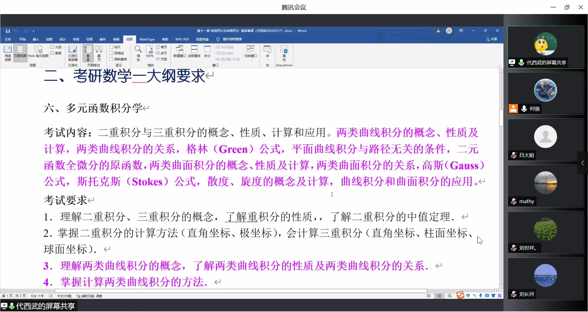 5月18日下午,高等数学教学团队线上开展了2022年春季学期的第三次集体备课,共同研讨《高等数学A(2)》第十一章的教学内容,并对本学期线上授课中的问题进行梳理。高等数学教学团队和青年教师参加了集体备课,会议由数学与数据科学系副主任何强老师主持。