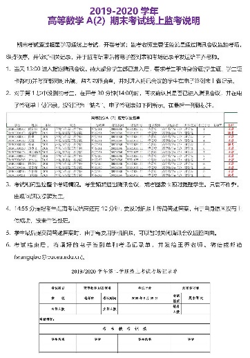 其次,高等数学线上期末考试共安排了三十个考场,每个考场安排了一位主监考教师。教学团队不仅对监考老师发布了监考说明,进行了核查身份、线上监控、定时提醒等培训,而且要求所有监考老师以学生身份参与了模拟考试,确保他们熟悉学生线上考试的全过程,并能够及时处理考试中的各种偶发事件。