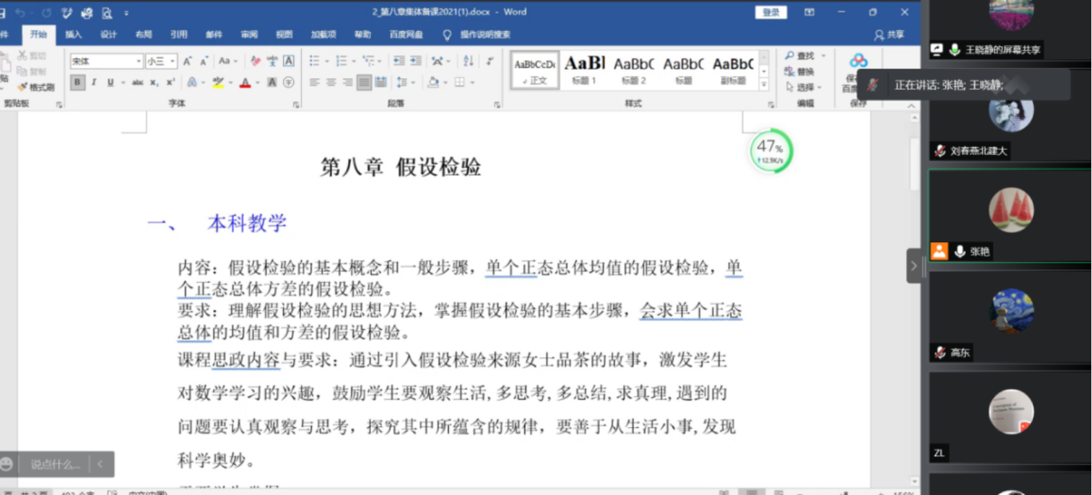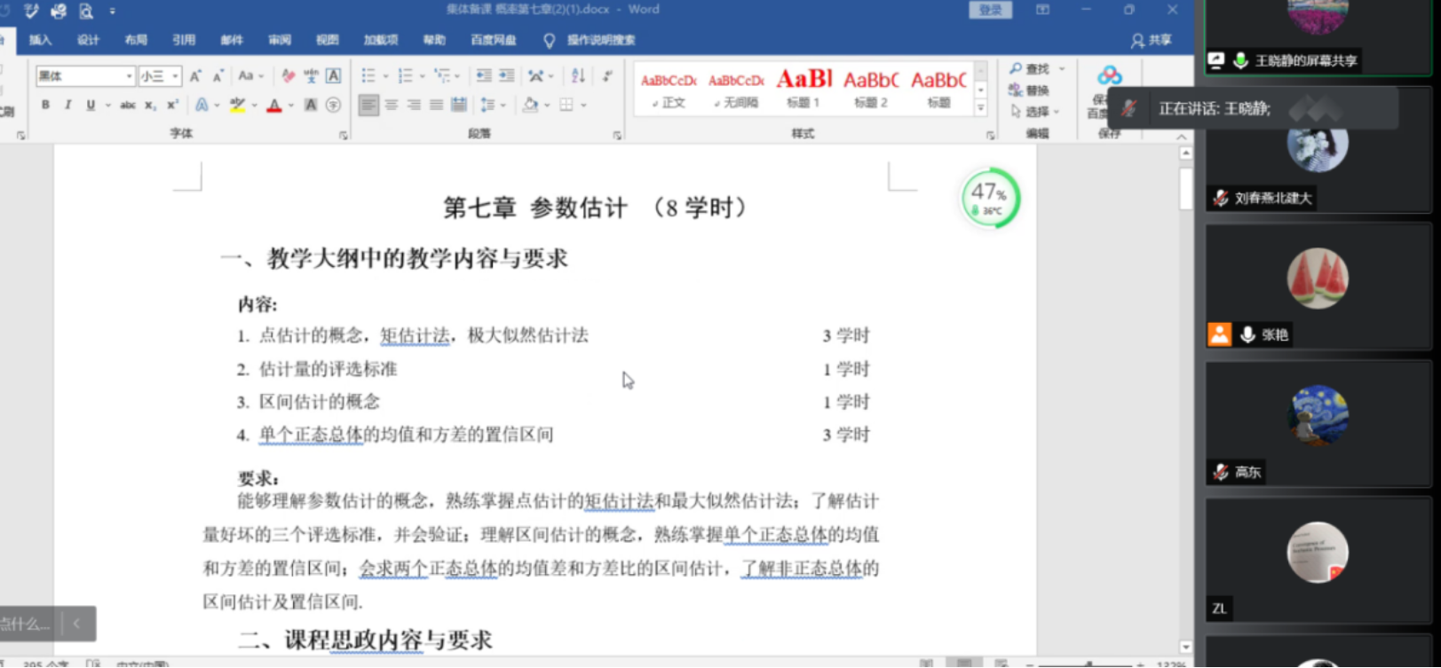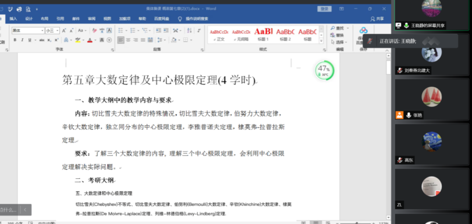 2021年11月16日下午,概率论与数理统计教学团队通过腾讯会议进行了本学期第二次集体备课,主要研讨了第五章到第八章的教学内容,以及对期末考试的安排。会议由团队负责人张艳老师主持,全体任课教师参加了会议。