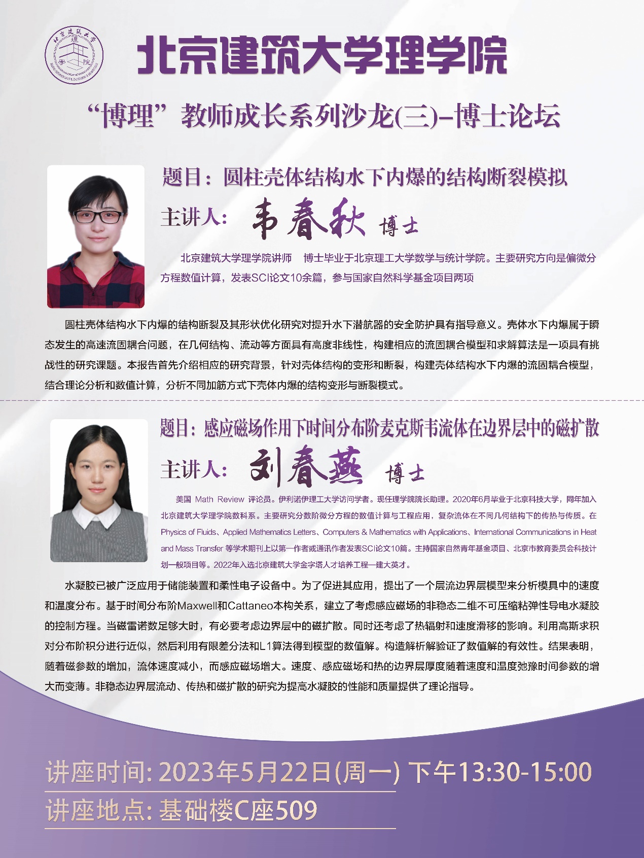 活动邀请了偏微分方程数值计算领域的韦春秋老师和分数阶微分方程工程应用领域的刘春燕老师进行主题分享。韦春秋博士以“圆柱壳体结构水下内爆的结构断裂模拟”主题,介绍了圆柱壳体结构水下内爆的结构断裂及其形状优化研究对提升水下潜航器的安全防护具有指导意义。随后,刘春燕博士以“感应磁场作用下时间分布阶麦克斯韦流体在边界层中的磁扩散”为主题,介绍了为促进水凝胶的应用而提出的边界层模型来分析模具中的速度和温度分布。非稳态边界层流动、传热和磁扩散的研究为提高水凝胶的性能和质量提供了理论指导。