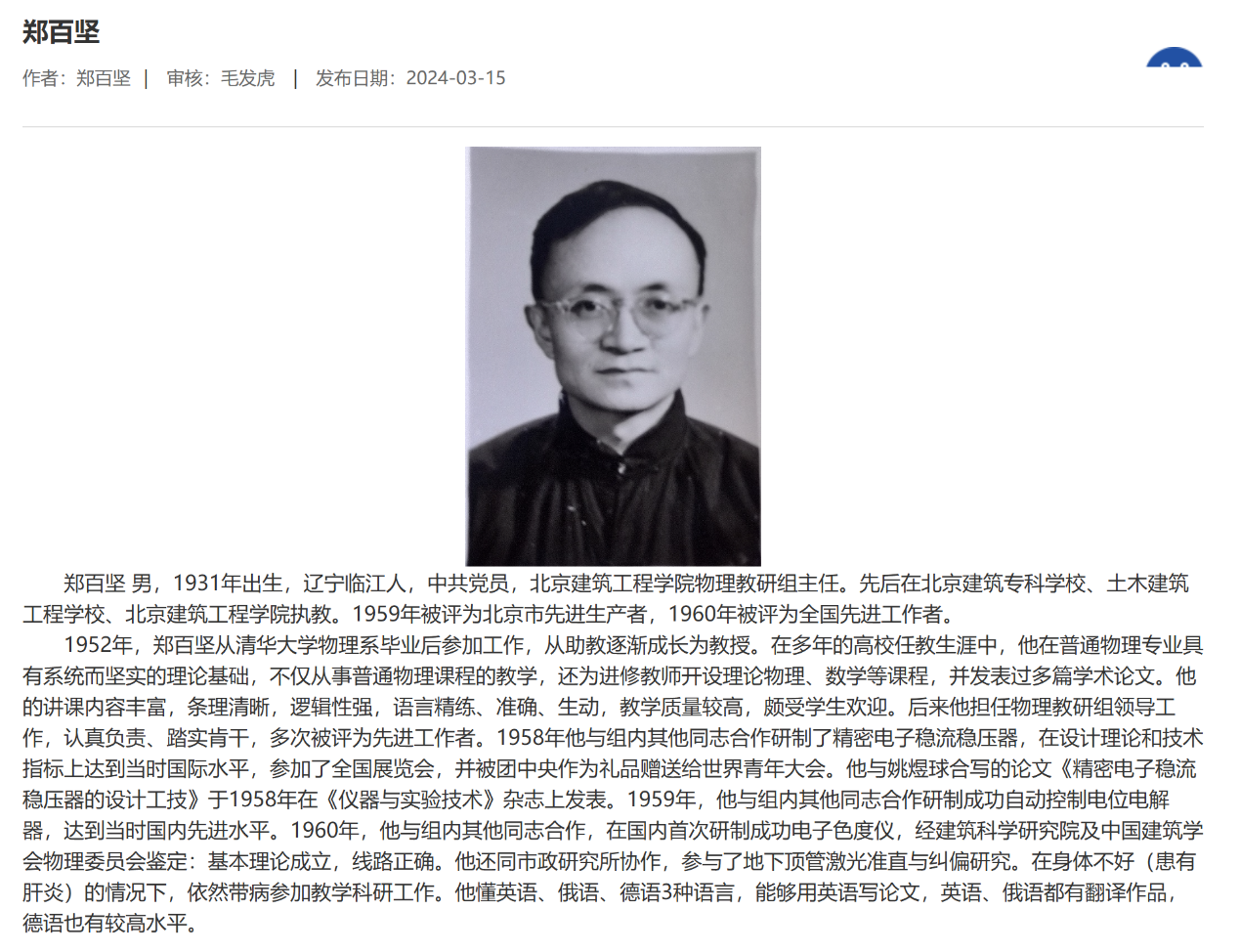 郑百坚,男,1931年出生,辽宁临江人,中共党员,北京建筑工程四川麻将游戏 物理教研组主任。先后在北京建筑专科学校、土木建筑工程学校、北京建筑工程四川麻将游戏 执教。1959年被评为北京市先进生产者,1960年被评为全国先进工作者。