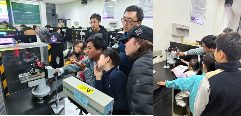 本次活动精心设计了“光学实验大挑战”与“科学大玩家”两大主题板块。在“光学实验大挑战”中,黄尚永老师指导校友与孩子们亲手观察并调节迈克尔逊干涉仪,记录下干涉条纹的微妙变化。黄老师介绍道,该实验在物理学史上地位卓著,其研究成果不仅助力迈克尔逊成为美国首位诺贝尔物理学奖得主,更对爱因斯坦提出相对论产生了深远启发。同时,实验装置考察并提升极为精密的读数能力,恰好体现了我校“实事求是,精益求精”的治学精神。