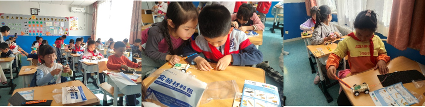 伴随着科学知识学习的热情,活动进入到动手实践和实验体验环节,同学们利用实验材料制作了弹力计和小车,根据空载或载重小车在光滑桌面和粗糙砂纸上的滚动测量拉力,进而分析摩擦力的大小和影响因素。动手实践环节让孩子们能更直观的理解科学原理,激发了科创热情,助力学生在学习与生活中塑就发挥创造潜能,敢于创新、团结协作的精神。