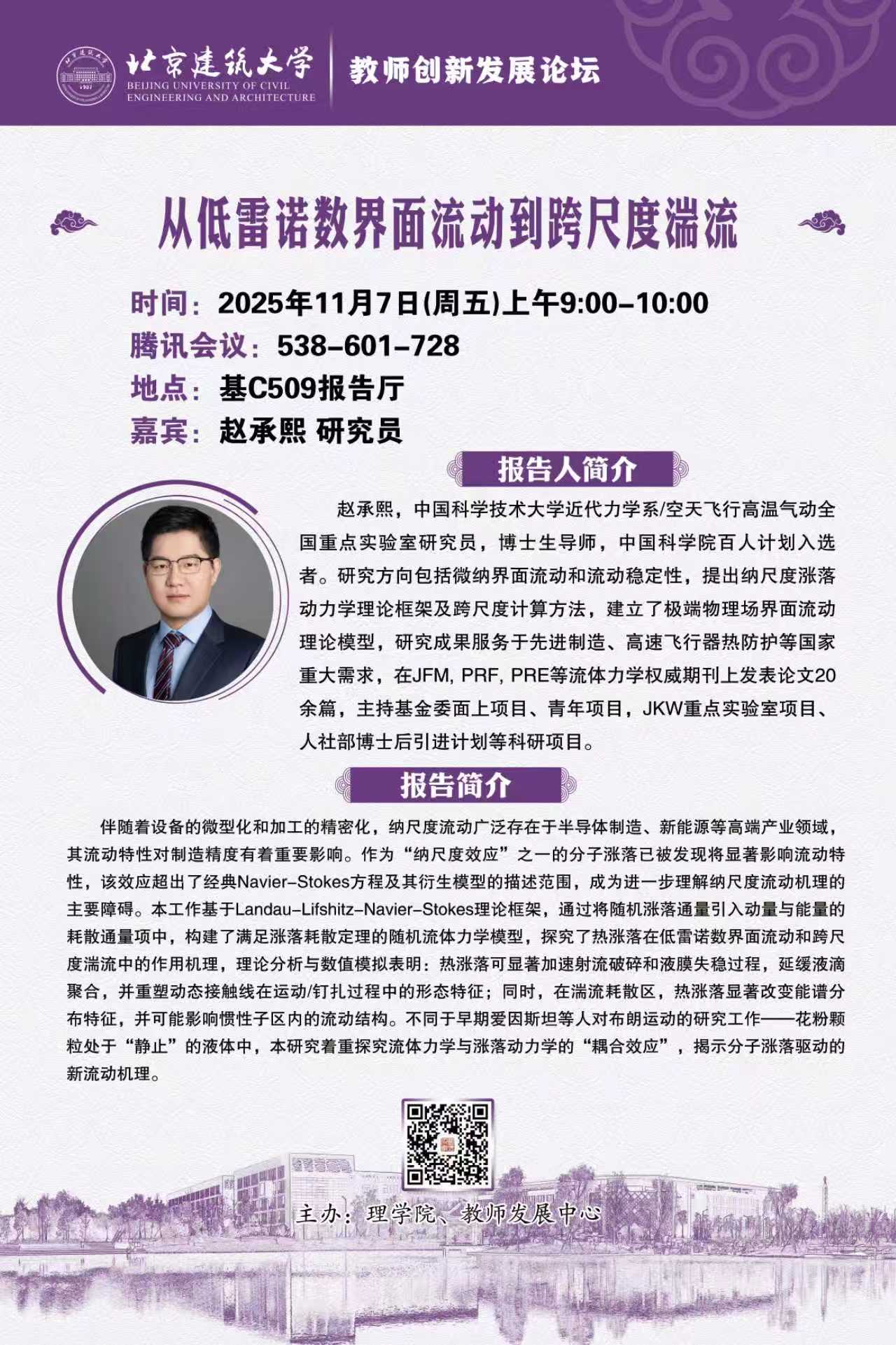 2025年11月7日上午9:00至10:00,四川麻将游戏 在基C-509报告厅成果举办学术讲座。本次报告特邀中国科学技术大学近代力学系、空天飞行高温气动全国重点实验室研究员、博士生导师赵承熙,作题为《从低雷诺数界面流动到跨尺度湍流》的专题报告。会议由四川麻将游戏 负责日常工作的副院长王恒友主持,智能计算及工程应用团队负责人张艳教授及课题组二十余名师生现场参与,并同步开设线上腾讯会议会场。会议开场,王恒友副院长简要介绍了赵研究员的学术背景与研究方向,并代表四川麻将游戏 致欢迎辞。