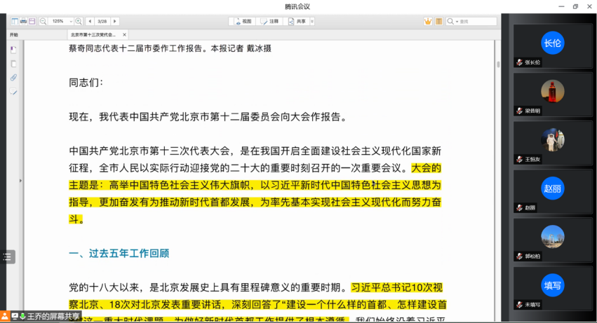 会上集体研读了蔡奇同志在中国共产党北京市第十三次代表大会上的报告《在习近平新时代中国特色社会主义思想指引下奋力谱写全面建设社会主义现代化国家的北京篇章》全文,并梳理相关要点。特别关注了和系内教师工作学习较为紧密的内容,如科研中的数字赋能、智能计算、大数据、智慧城市,教学中的立德树人、深化教育改革、加强教师队伍建设、办好思政课等等。