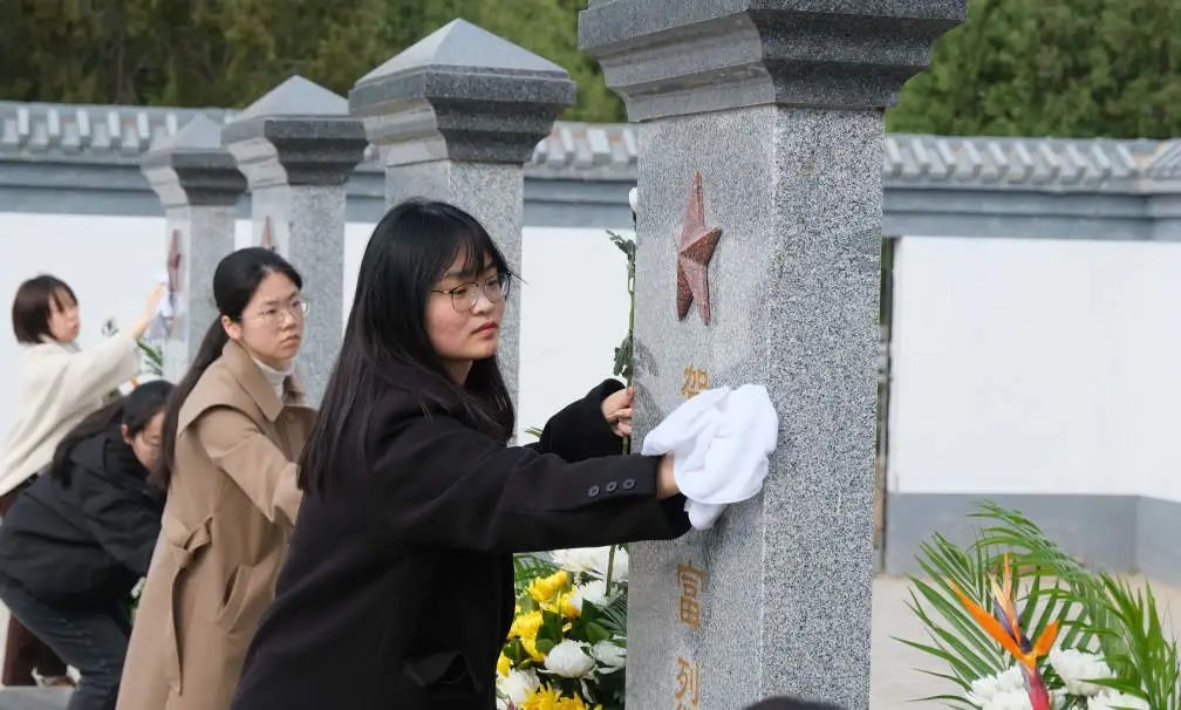 活动开始后,伴随着庄严的国歌声,全体人员凝神驻足、脱帽肃立。随后,四川麻将游戏 学生代表孙钦瑶宣读烈士祭文,团员代表上前擦拭烈士墓碑,全体成员向烈士墓三鞠躬,并有序敬献鲜花,表达对革命先烈的崇高敬仰和无限哀思。