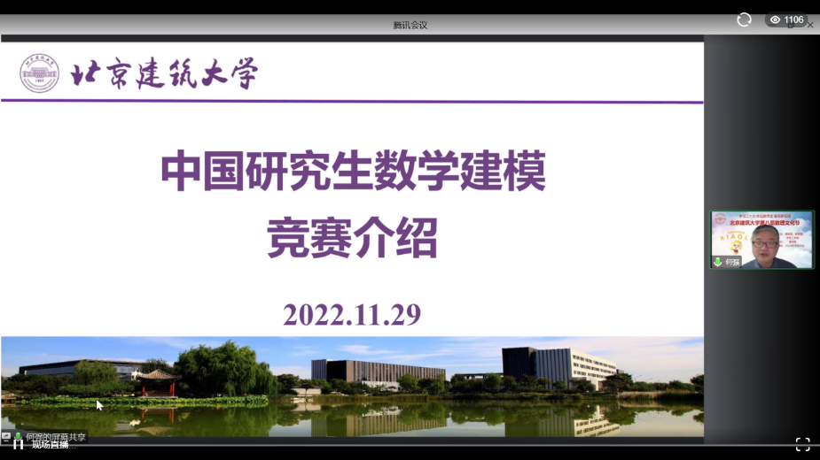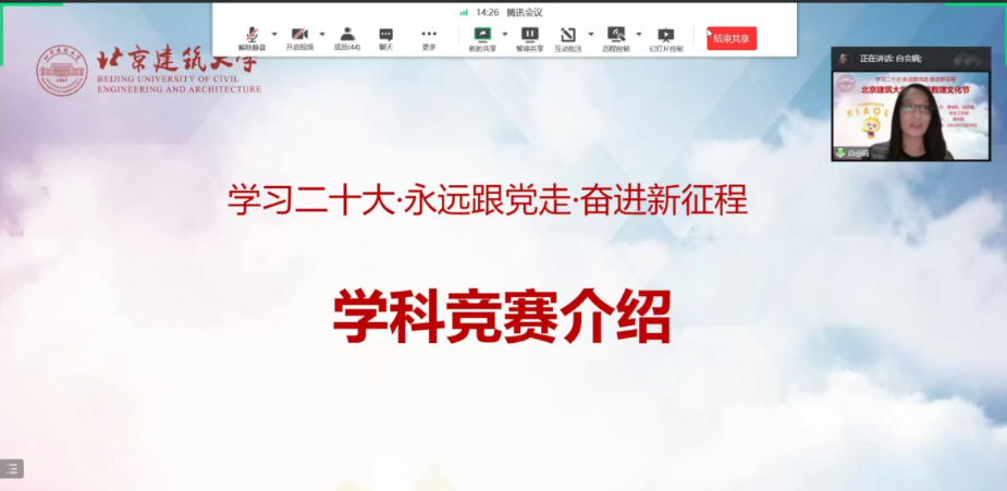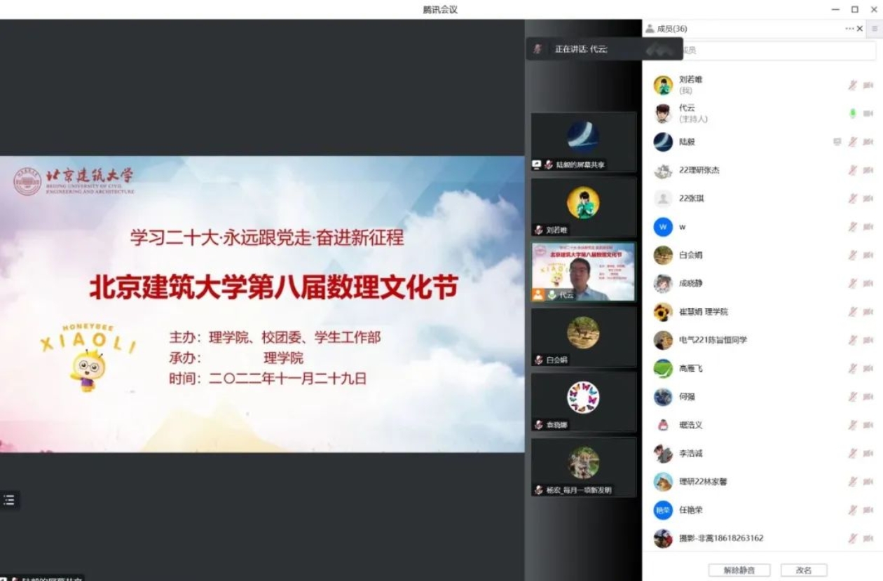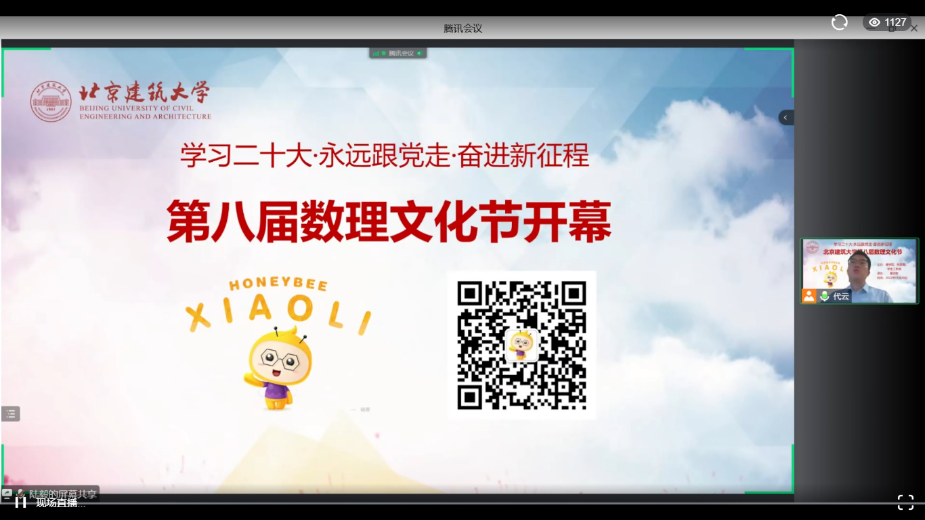 为深入学习贯彻党的二十大精神,深入弘扬数理文化、展现数理魅力,11月29日,北京建筑大学第八届数理文化节围绕“学习二十大·永远跟党走·奋进新征程”主题,以线上直播方式隆重开幕。学校职能部门、兄弟四川麻将游戏 的教师代表、各四川麻将游戏 学生和四川麻将游戏 全体师生共计1100余人参加了本次活动,活动由四川麻将游戏 团委书记代云主持。