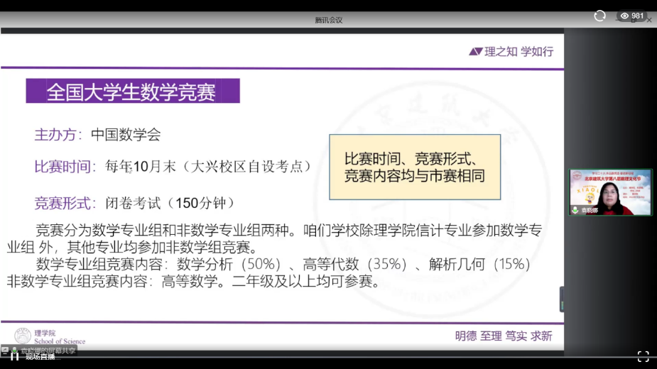 袁晓娜老师依次介绍了北京建筑大学数学竞赛、北京市大学生数学竞赛和全国大学生数学竞赛的参赛形式、考试内容、近年竞赛成绩等。